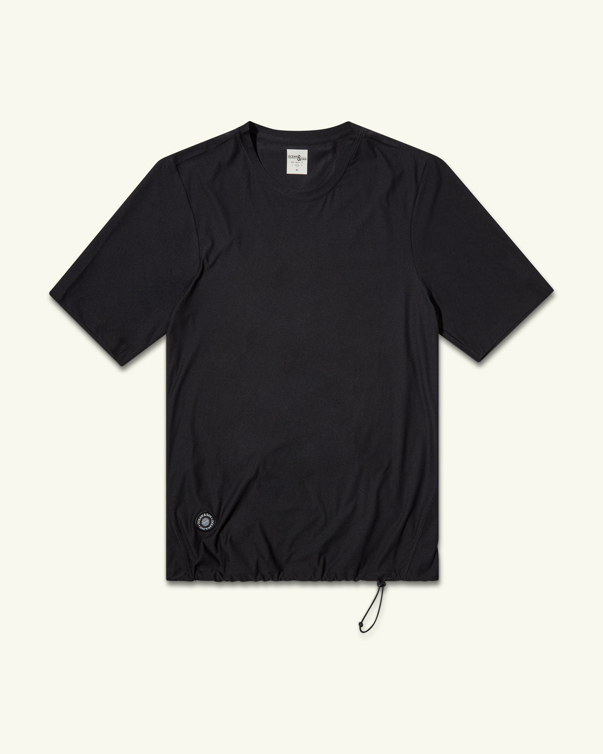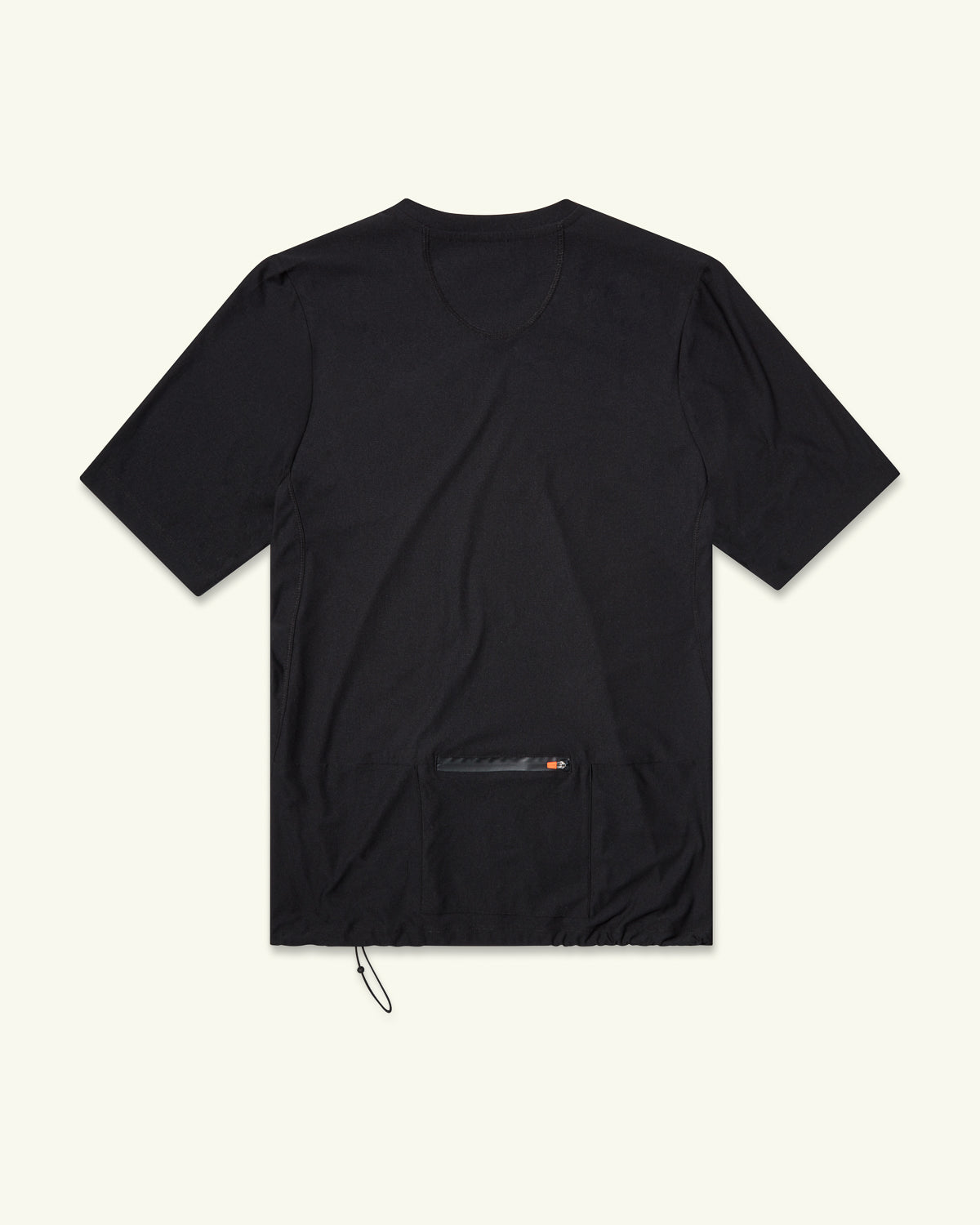 Garment sizing is optimally designed for a cycling position. Bottom of the shirt sits at the hips to minimize fabric overhang in the front and mitigate sag in the back when the pocket is in use. The sleeves sit just above the elbow to optimize for full coverage when in the riding position. Drawstring bungee waist cord allows adjusting the garment length depending on use and riding conditions.