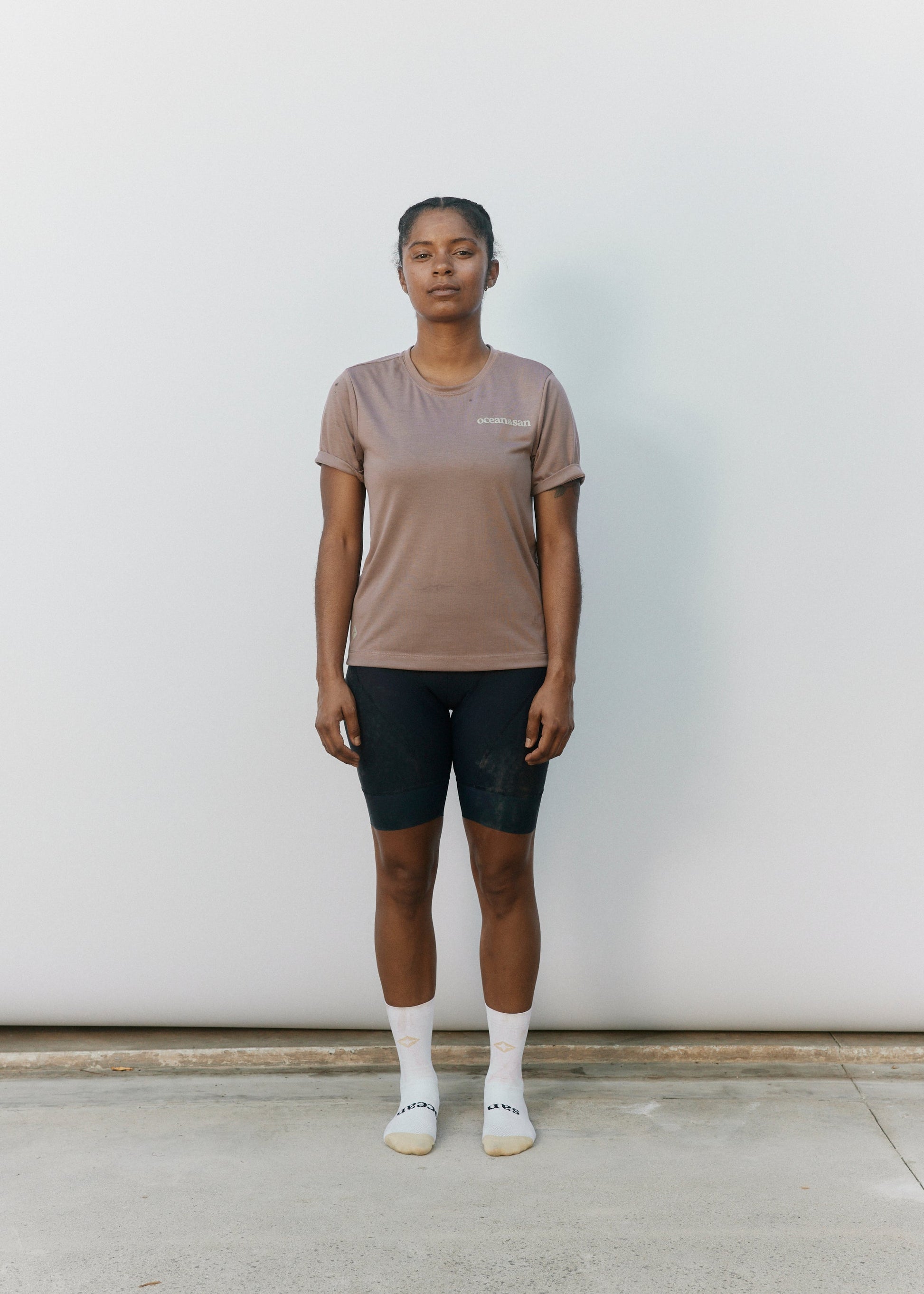 model wearing casual cycling shirt, cycling shirt, womens cycling bib shorts