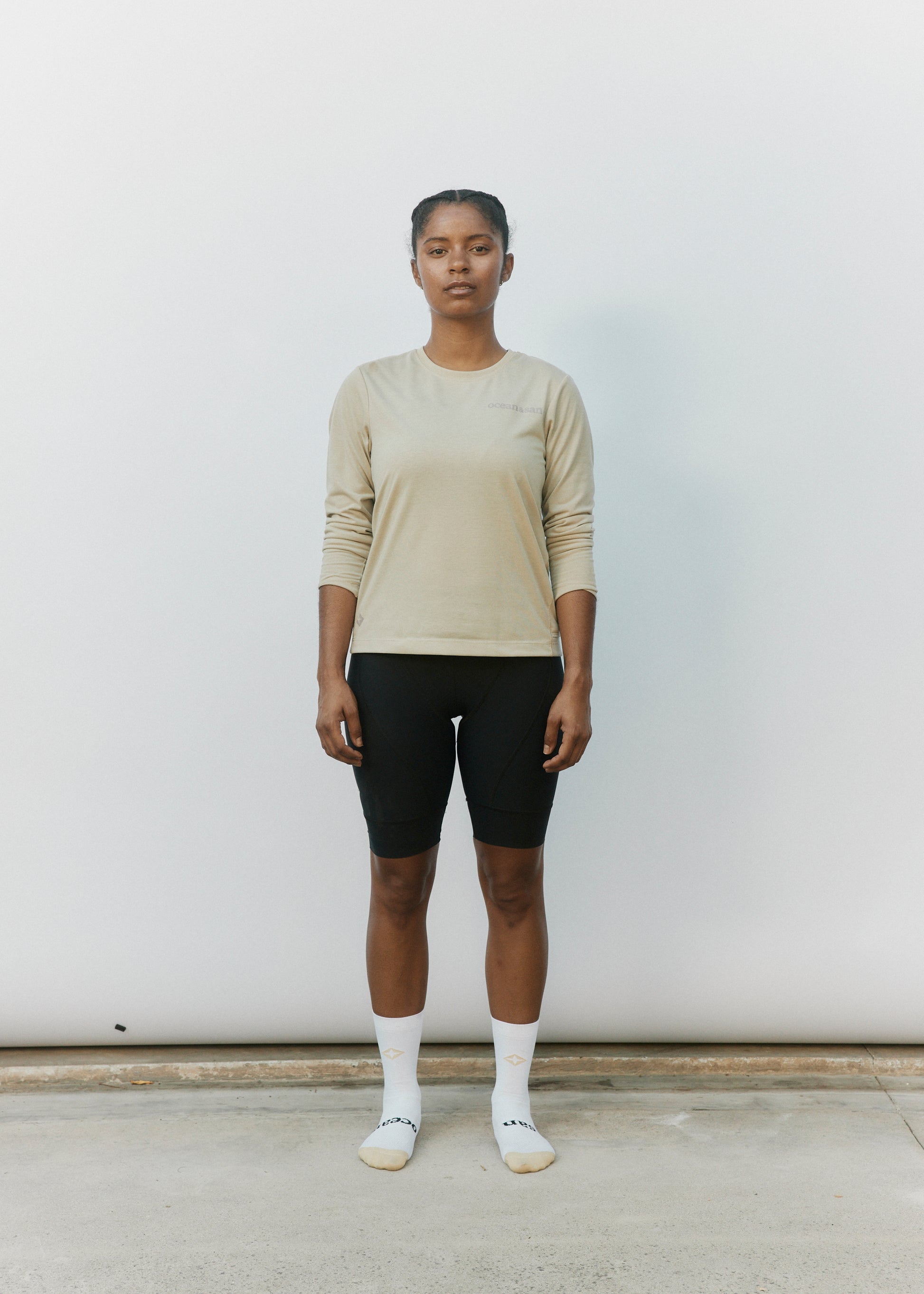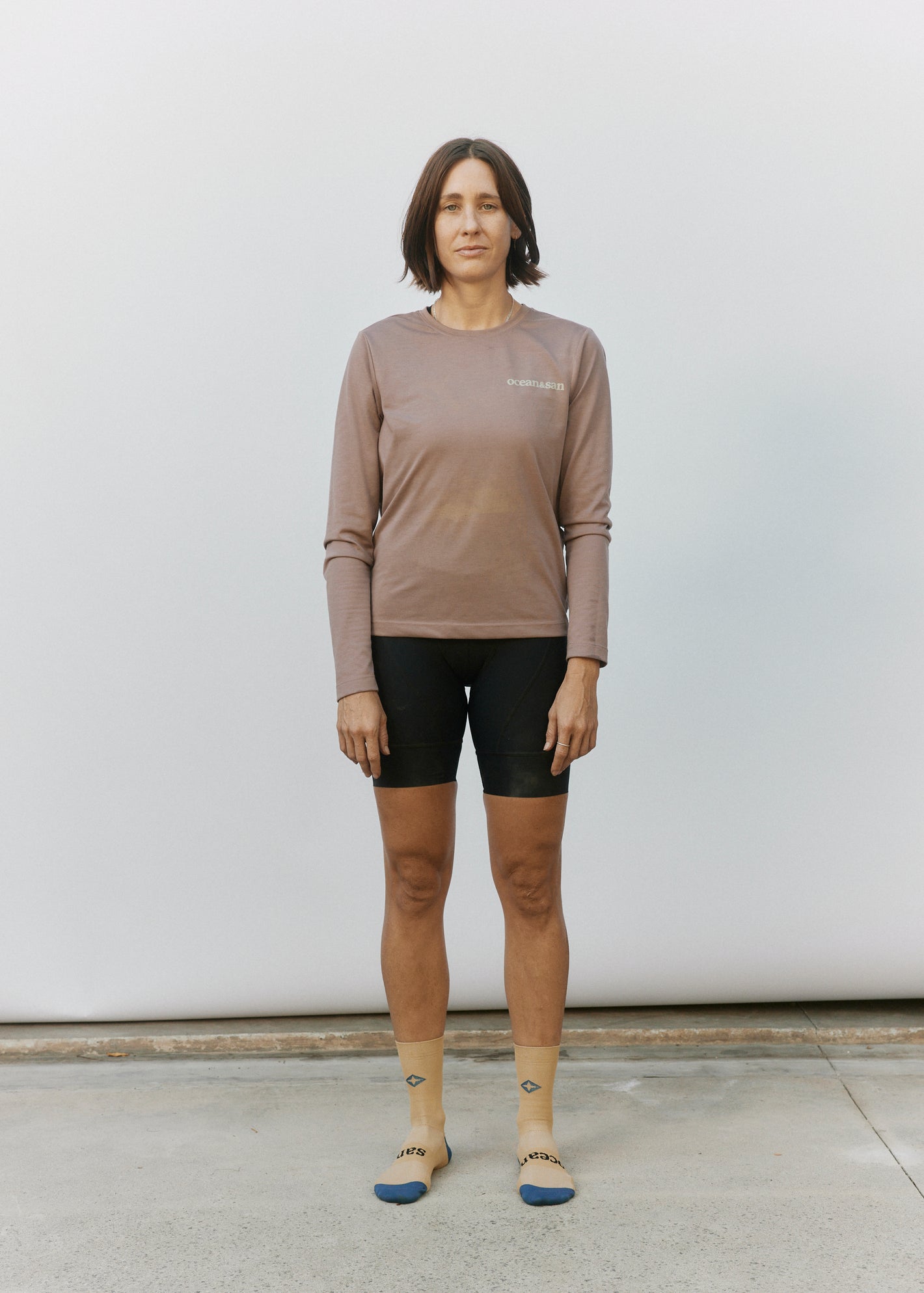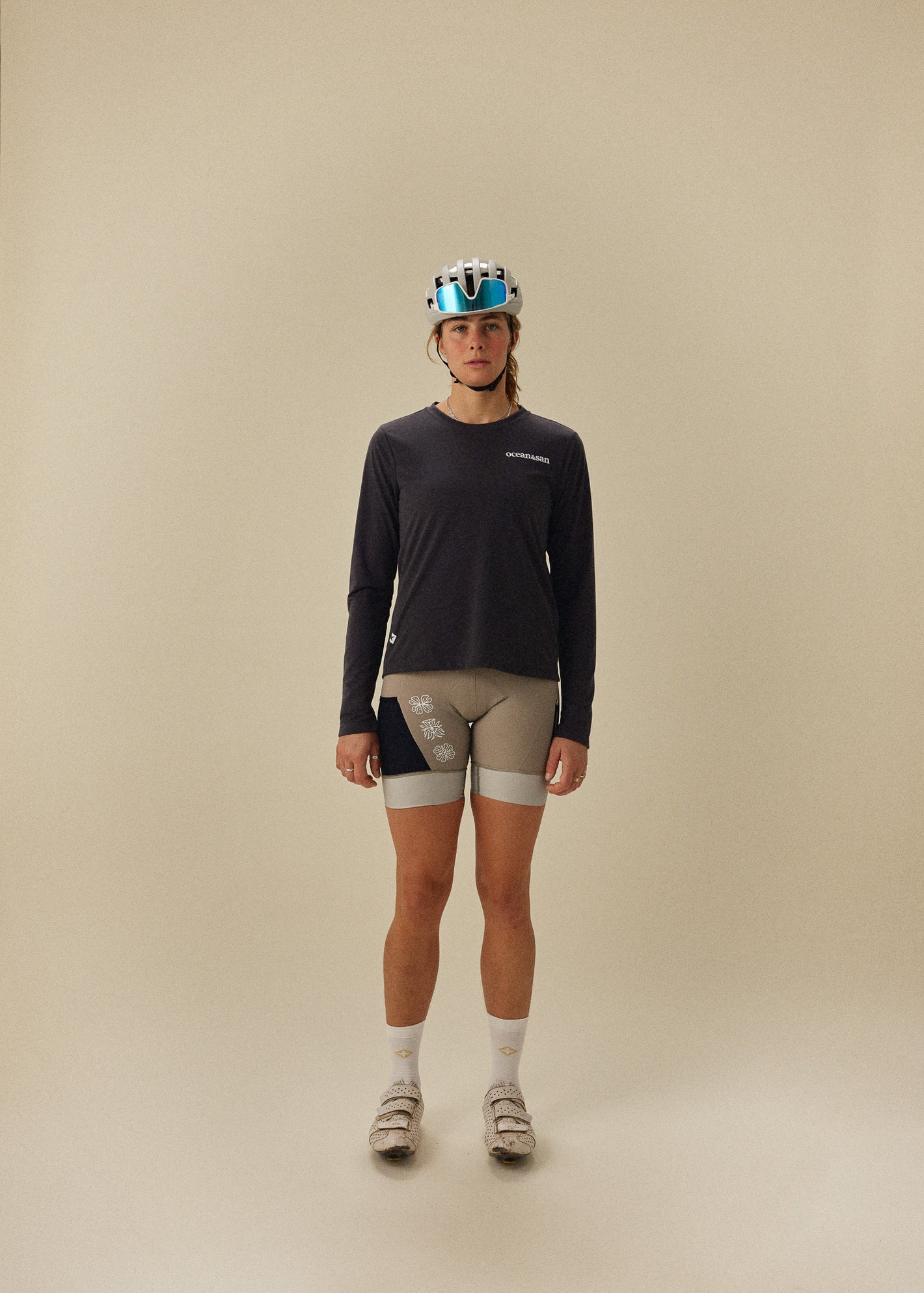 model wearing womens cycling long sleeve shirt, long sleeve womens cycling shirt, long sleeve cycling shirt, long sleeve shirt with pockets
